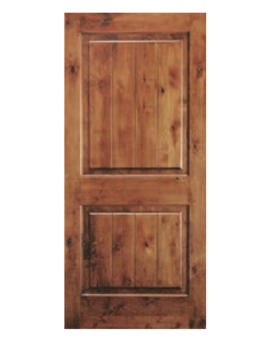 Enhance your space with the timeless elegance of our 2-Panel Square Top V-Groove wood door. Crafted from high-quality solid wood, this door features a classic two-panel design with a square top and distinctive V-groove detailing, adding depth and character. The natural wood grain, enriched with knots and rich textures, delivers a rustic yet sophisticated look, making it an ideal choice for homes, cabins, and farmhouse-style interiors.