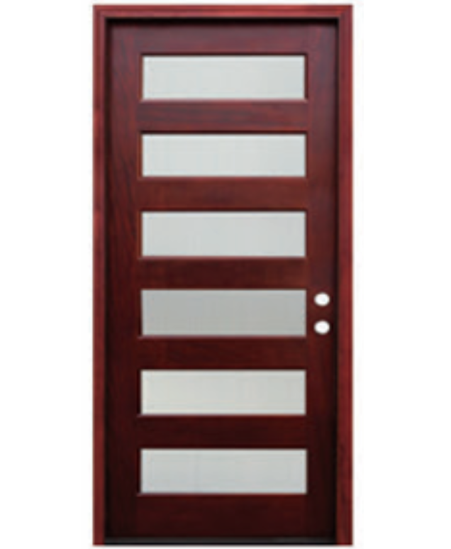 The door features five horizontal frosted glass panels, which allow natural light to flow through while maintaining privacy. The sleek design, combined with the deep mahogany tone, makes it a perfect choice for both traditional and modern homes.