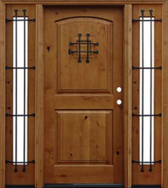 Make a bold and elegant statement with this Rustic Knotty Alder Wood Entry Door, featuring a speakeasy window with wrought iron grille and matching sidelights with decorative iron accents. Built for both durability and style, this door enhances any home with its classic rustic charm and strong craftsmanship, making it perfect for farmhouse, Mediterranean, and Old-World architectural styles.